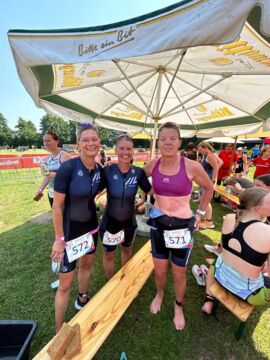 Bei hitzigen Temperaturen durften sich die Starterinnen um 11.15 Uhr erstmal 750m abkühlen, bevor sie auf den 20 km Radkurs und die 5 km Laufstrecke wechseln durften. Die Positionen unserer 98er veränderten sich nach dem Schwimmausstieg nicht, Petra kam kurz vor Iris und Melanie aus dem Wasser. Kurz vor dem Ziel waren die 3 Mädels so eng zusammen, dass sie Hand in Hand durchs Ziel liefen!! Teamsport und Platz 13 in der Mannschaftswertung, Herzlichen Glückwunsch!
